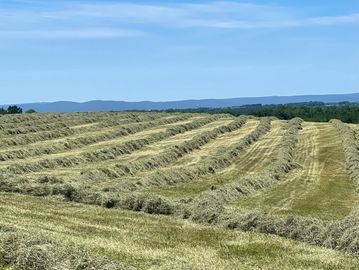 Our first hay fields were planted in Fall 2021 and harvested in Summer 2022. Pictured above is our horse quality hay raked into windrows prior to baling.
